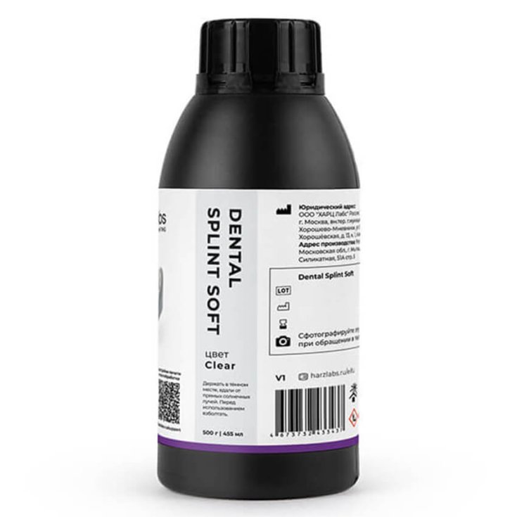 Фотополимерная смола HARZ Labs Dental Splint Soft – это гибкий и прочный фотополимер, предназначенный для изготовления жестко-эластичных капп и сплинтов. Состав смолы позволяет использовать ее даже в небольших помещениях, ведь она практически не имеет запаха, не вызывает аллергических реакций, не выделяет паров. Изделия из фотополимерной смолы можно обрабатывать в автоклаве, они химически устойчивы и соответствуют требованиям ГОСТ Р ИСО 10993.
