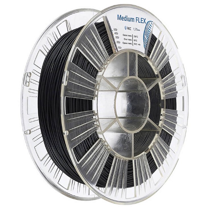 Главная / Пластик для 3D-принтеров / Спецпластик / TPU / Катушка пластика REC Medium Flex 1.75мм 0.5 кг, черная