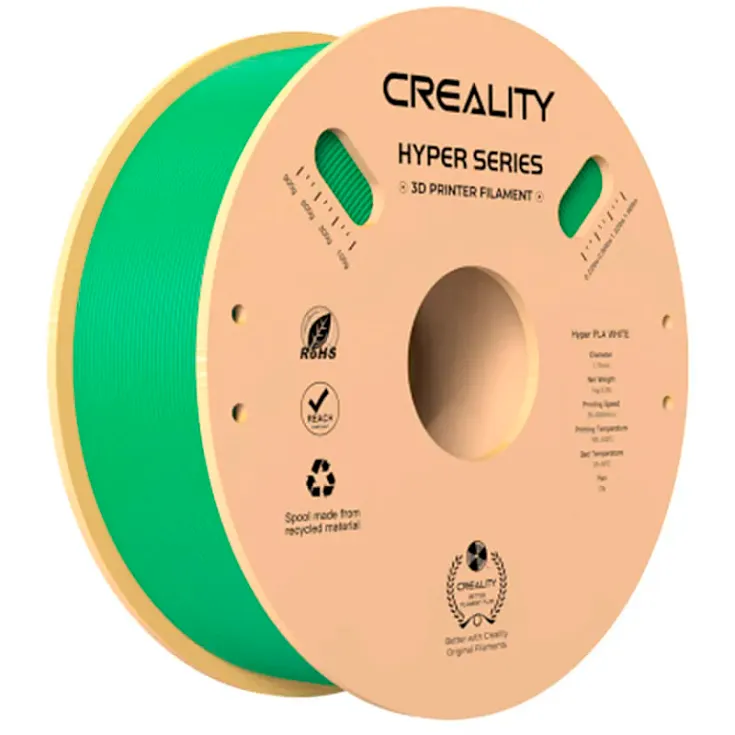 Пластик Hyper PLA от Creality зеленого цвета отличается исключительной текучестью и способностью быстро застывать, обеспечивая эффективную экструзию и скорость печати до 600 мм/сек. Отличительными особенностями Hyper PLA Creality являются высокая прочность на разрыв (превосходящая прочность ABS) и большая жесткость (по сравнению с PLA), что обеспечивает создание крепких моделей. Плотная намотка и точный диаметр нити способствуют плавной печати, предотвращая спутывание нитей.