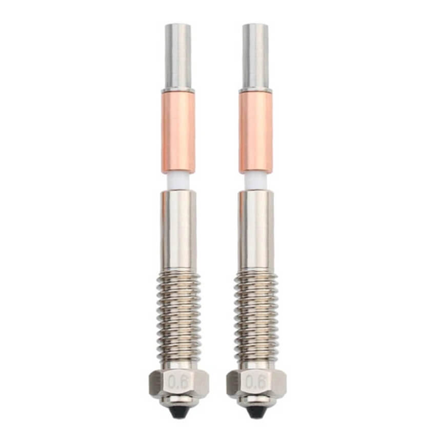 Биметаллическое сопло имеет цельнометаллическую конструкцию, что позволяет быстро снимать и очень легко его заменять. Рекомендуется использовать только один тип филамента в одном сопле. Смена пластиков со значительной разницей в температуре может привести к засорению сопла.