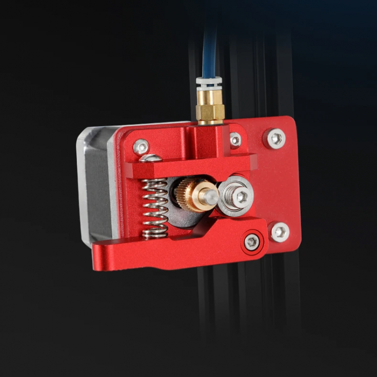 Следующим обновлением стала очень прочная металлическая рама экструдера, которая обеспечивает более сильное давление при проталкивании нити через сопло 3D-принтера, что улучшает общую производительность печати. Экструдер снабжен регулируемым болтом, который позволяет регулировать давление механизма экструдера.