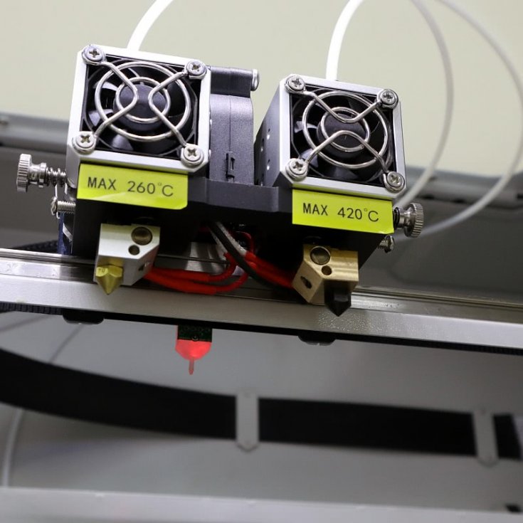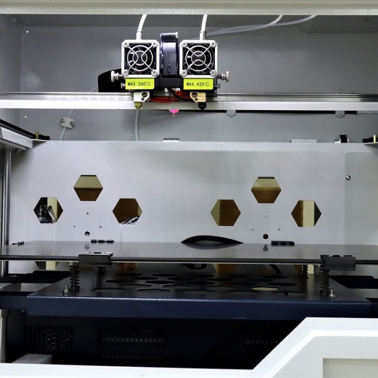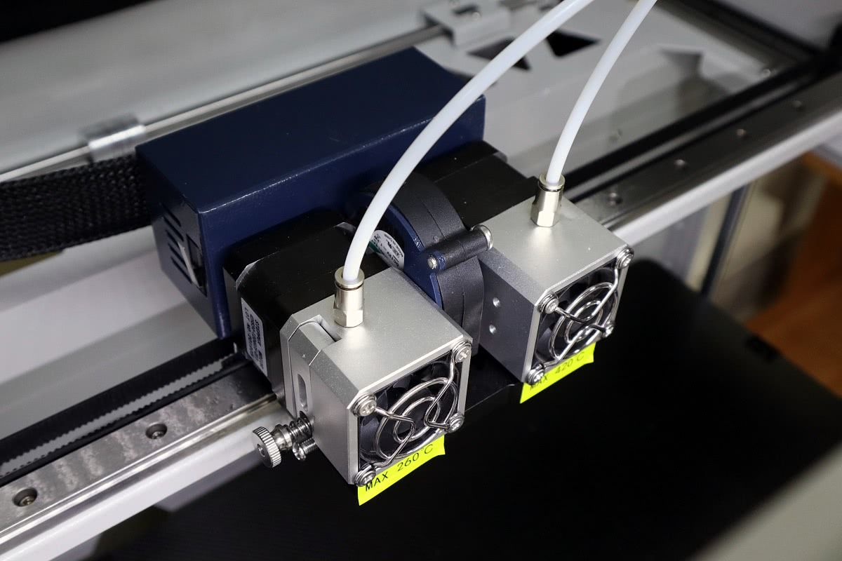 3D принтер оснащен сменным двойным экструдером, левый нагревается до 260 °C и используется для печати стандартными пластиками (PLA, ABS, PC, Nylon, Carbon, Flex и пр.). Правый экструдер из мартенситной стали с нагревом до 420 °C предназначен для печати высокотемпературными материалами (PEEK, ULTEM и пр.).